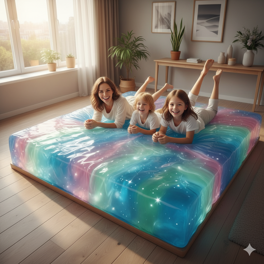 A jelly bed is essentially a mattress or bed platform made of or filled with a translucent, soft PVC/TPU “jelly” material (or a gel-infused foam mattress with a jelly-look layer) that gives a squishy, bounce-y effect when you lie or jump on it. Many of them are sold under the names “jelly mattress,” “squishy bed,” “gel bed mattress,” or “kids’ jelly bed”. While they share traits with water beds or inflatable mattresses, they differ in texture (softer, more gel-like) and in appearance (often clear or coloured jelly layers).
